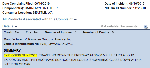 What’s clear is that the consumer complaints in the NHTSA’s database are only a fraction of the actual sunroof explosions occurring in the U.S.”