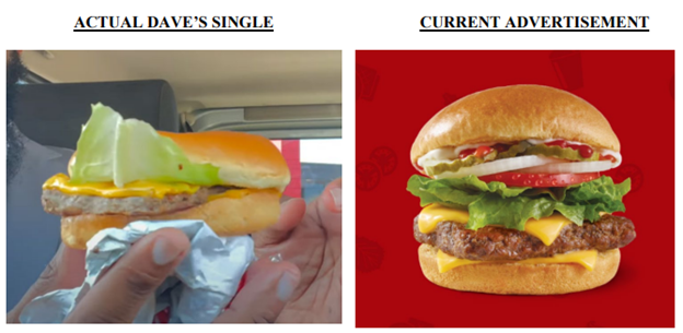 The complaint includes an image purporting to show a Wendy’s advertisement for a Dave’s Single burger next to the “actual burger served to customers”: