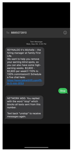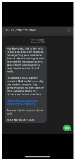 Per the case, the unsolicited October 18 message came from a different number belonging to Family First Life and stated in part that the company was “reaching out regarding your insurance license”: