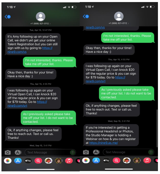 The plaintiff, a Philadelphia County, Pennsylvania resident, claims to have received the following text messages from Nine9, in which an agent promoted the company’s services and advertised professional headshots. Per the case, the plaintiff informed Nine9 on more than one occasion that he was not interested in the company’s products or services: